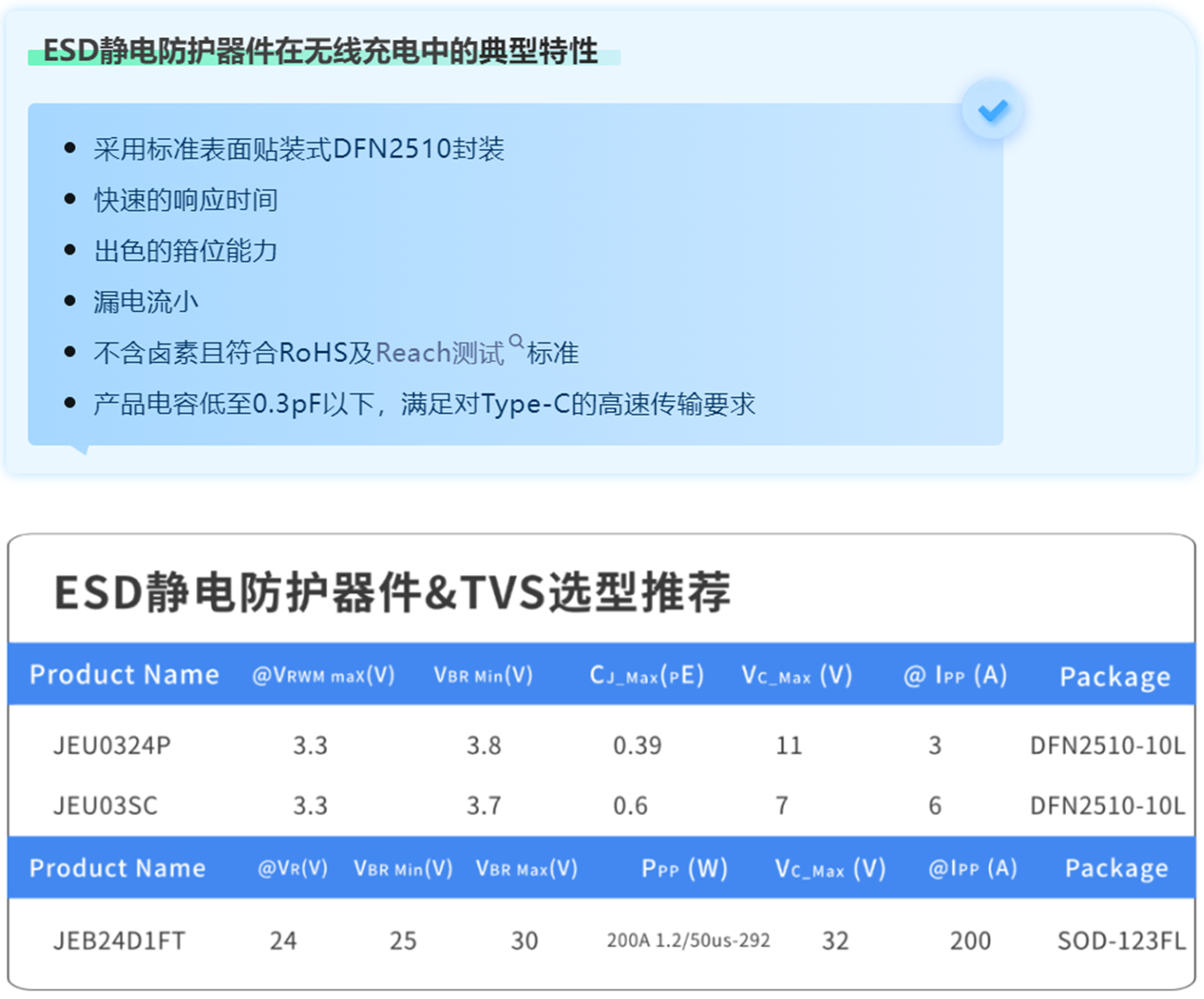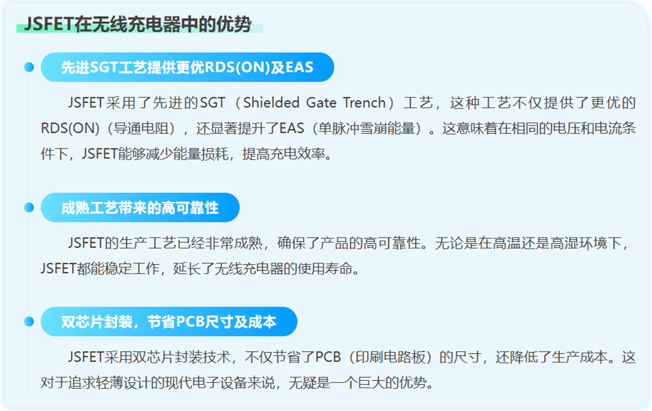 ESD防护器件、JSFET和MOSFET在无线充电器中的应用,不仅显著提升了充电效率,还大幅增强了设备的可靠性和耐用性。ESD防护器件有效防止静电放电对敏感电路的损害,确保设备在频繁插拔和复杂环境下的稳定运行。JSFET和MOSFET则通过其低导通阻抗和快速开关特性,优化了功率转换效率,减少了能量损耗,从而提高了无线充电的整体性能。