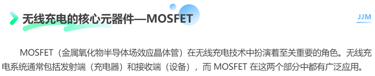 MOSFET(金属氧化物半导体场效应晶体管)在无线充电技术中扮演着至关重要的角色。无线充电系统通常包括发射端(充电器)和接收端(设备),而 MOSFET 在这两个部分中都有广泛应用。